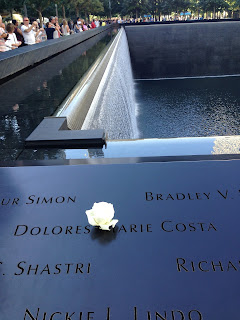 We exited the on and off bus and walked to Ground Zero and the 9/11 Memorial. I was surprised how far from it the bus let us off. Walking our feet off today. The Memorial is really something. We were told that each stream of water represents one of the people killed that day.